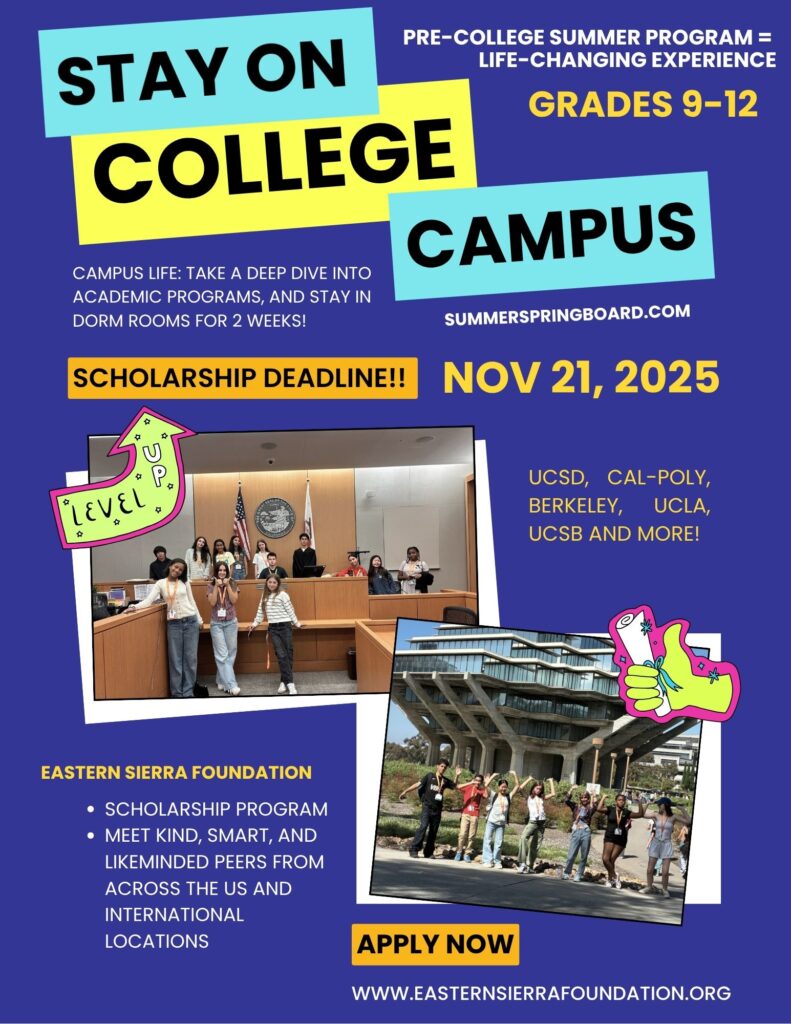 - Apply for the Eastern Sierra Foundation Scholarship for Summer of 2026 – – if you have a 3.6 or above!