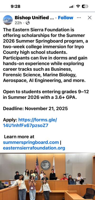 BISHOP, CA — Eight standout local students have been awarded scholarships to participate in the 2026 Pre-College Program. Summer programs let you “try on” a major in a stress-free environment. It’s the ultimate way to explore your interests and see what sticks before you have to make it official on a college application. Supported by $20,000 in community funding, these scholars will head to UCLA, UC Berkeley, and UC San Diego this summer to gain hands-on experience in high-level academic fields and get a head start on the university experience.